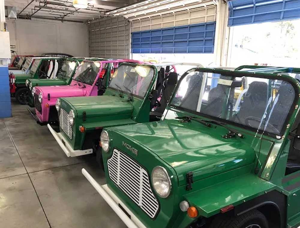 The biggest components of the Moke are made in America, including the glass, seat belts, tires and batteries. All ten batteries are made in America. The product is assembled here on American soil. If you have a problem with the batteries, we have them right here on the shelf. It’s easy to use, easy to wash. The whole car can be hosed down, inside and out. We offer a Bimini top so you’re half outdoors, half indoors. The look and design is better than the original because it is longer, wider and closer to an American car.
